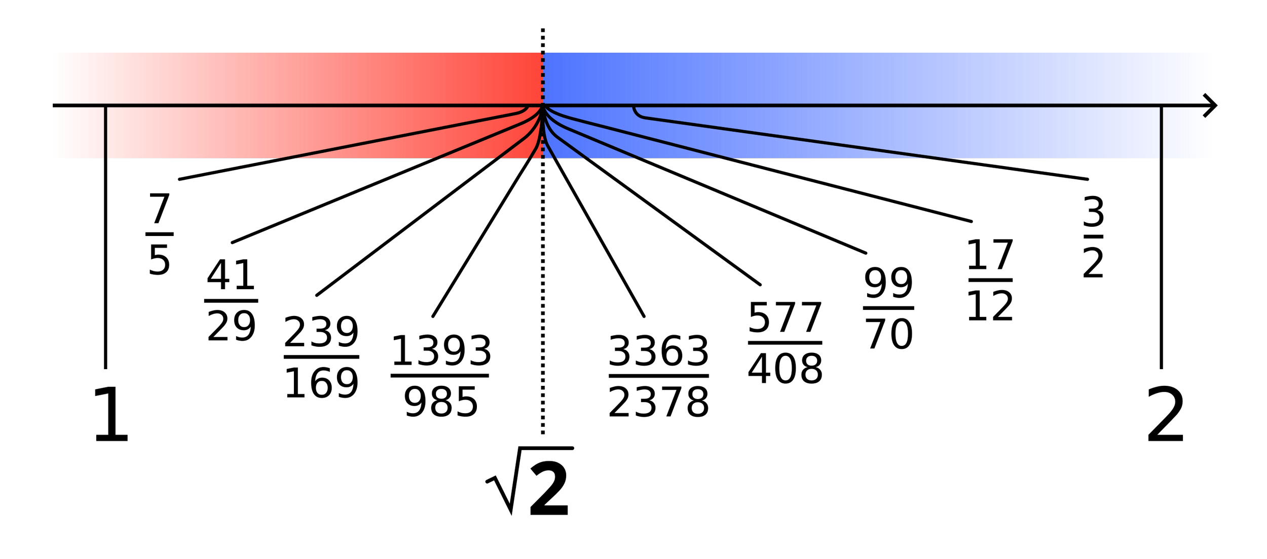 In the 1870s the German mathematician Richard Dedekind introduced the enduring concept of the “cut” which bears his name, the Dedekind cut, as he sought to explain why calculus works. How can we converge on irrational numbers like , , or as limits even though their decimal expressions defy precise capture and we can always zoom in to a finer degree? Dedekind showed us that we can divide real numbers into sets of those lower and higher than the limit, and that we can converge endlessly through increasing precision of rationals or decimal expansions, without ever reaching them. The number in question exists between each set as a border of infinitesimal width (Weisstein).